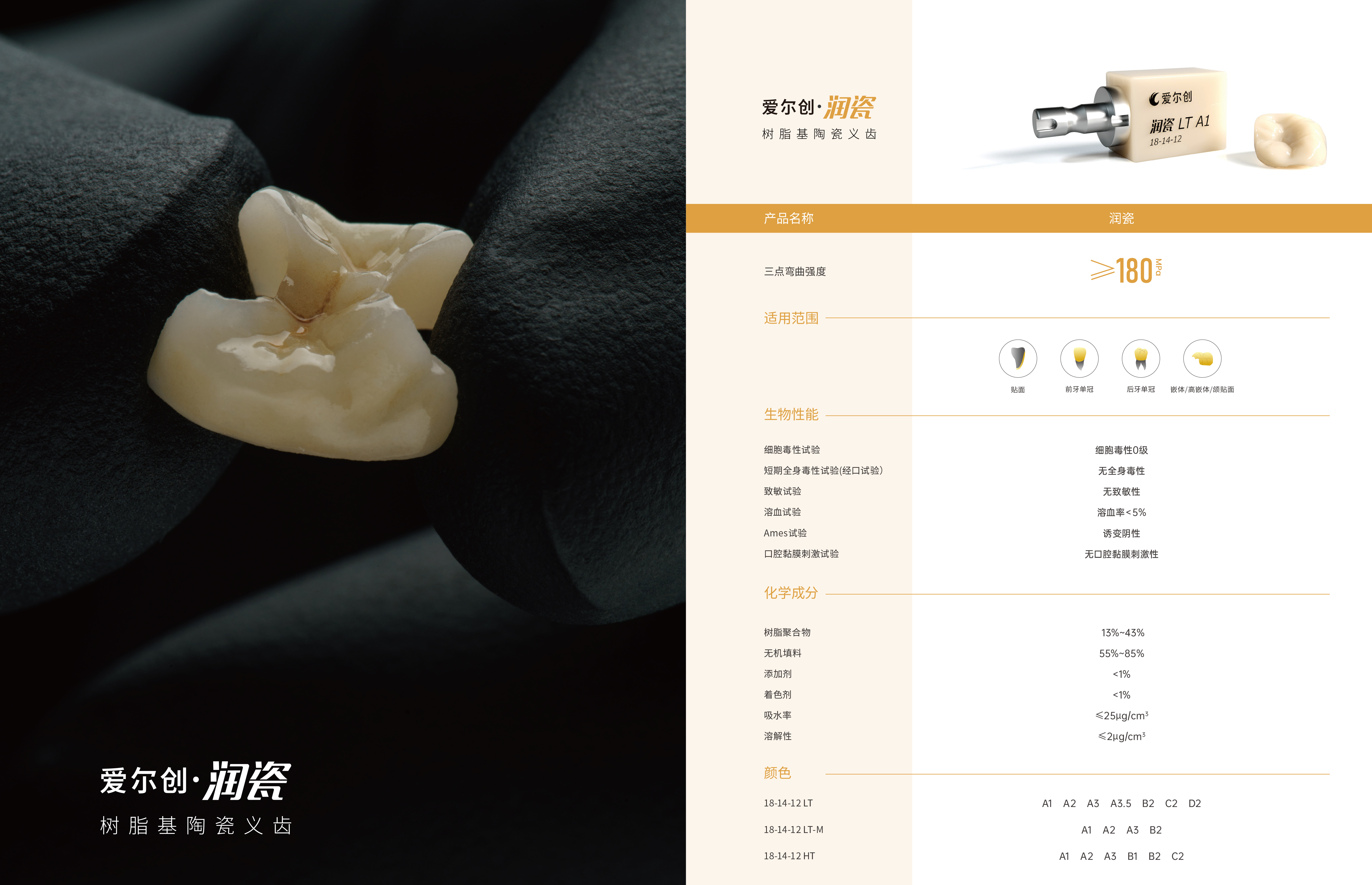 爱尔创预成聚合物基冠桥材料是树脂基陶瓷类义齿修复材料,品牌简称爱尔创·润瓷,旗下LT(低透)、HT(高透)和LT-M(颜色和透性分层)三款产品,在树脂基陶瓷领域中爱尔创是全球第一家推广渐变色的厂商产品树脂聚合度高、材料致密性优异,弯曲强度可达180MPa,且拥有优良的色稳定性和化学稳定性,弹性模量与牙本质接近,无需热处理工艺流程简单。产品适用于CAD/CAM工艺修复,主要应用于单颗修复病例,适用嵌体修复。